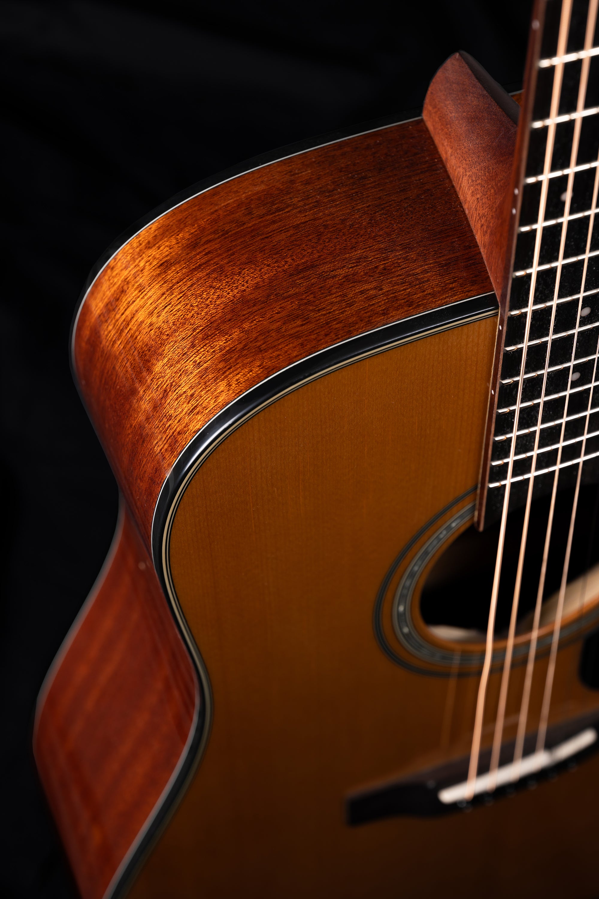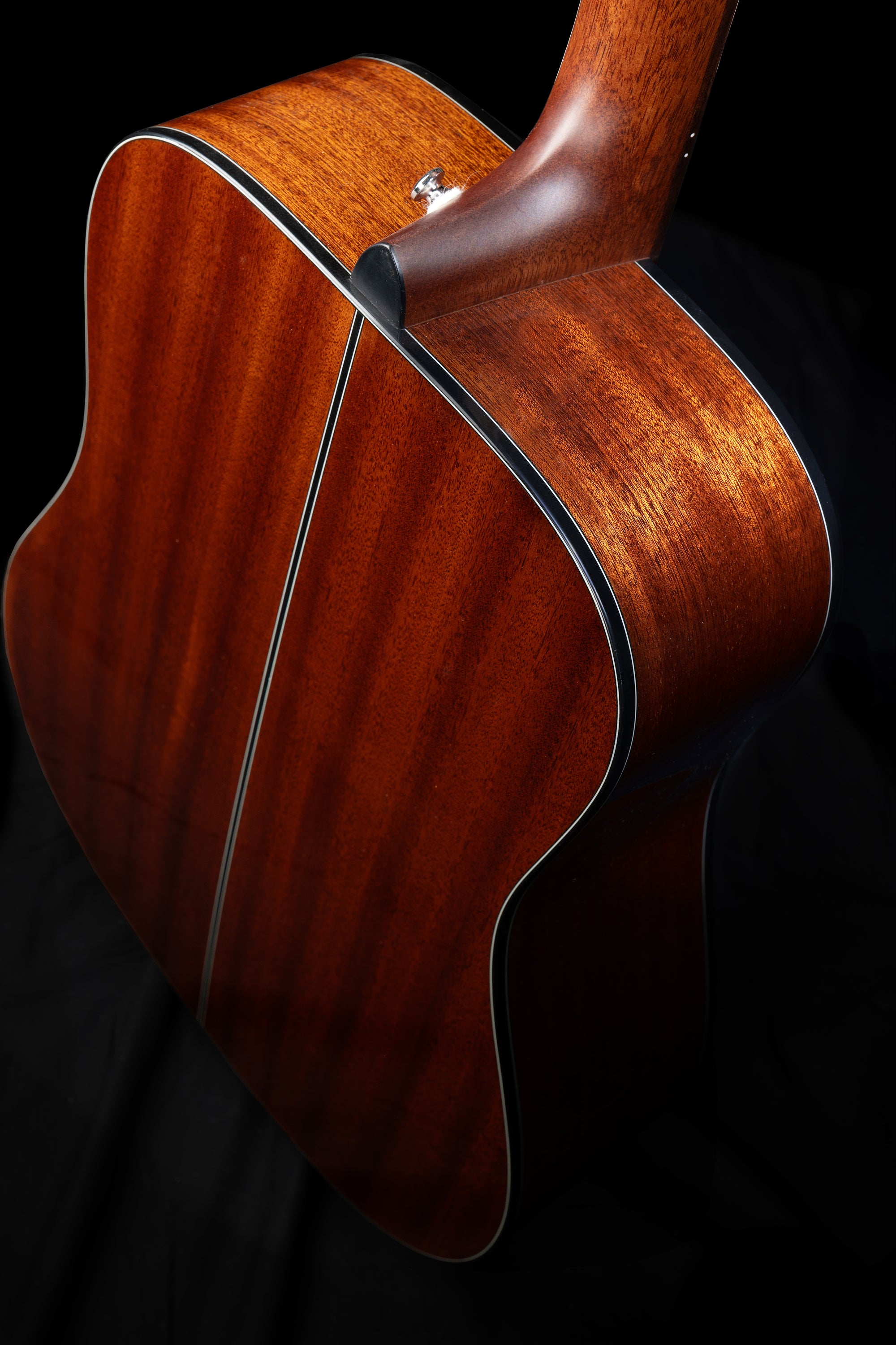 The slim mahogany neck with a satin finish ensures a comfortable playing experience, allowing for smooth transitions along the 12"-radius ovangkol fingerboard. This design caters to musicians who value both playability and responsiveness in their instrument.