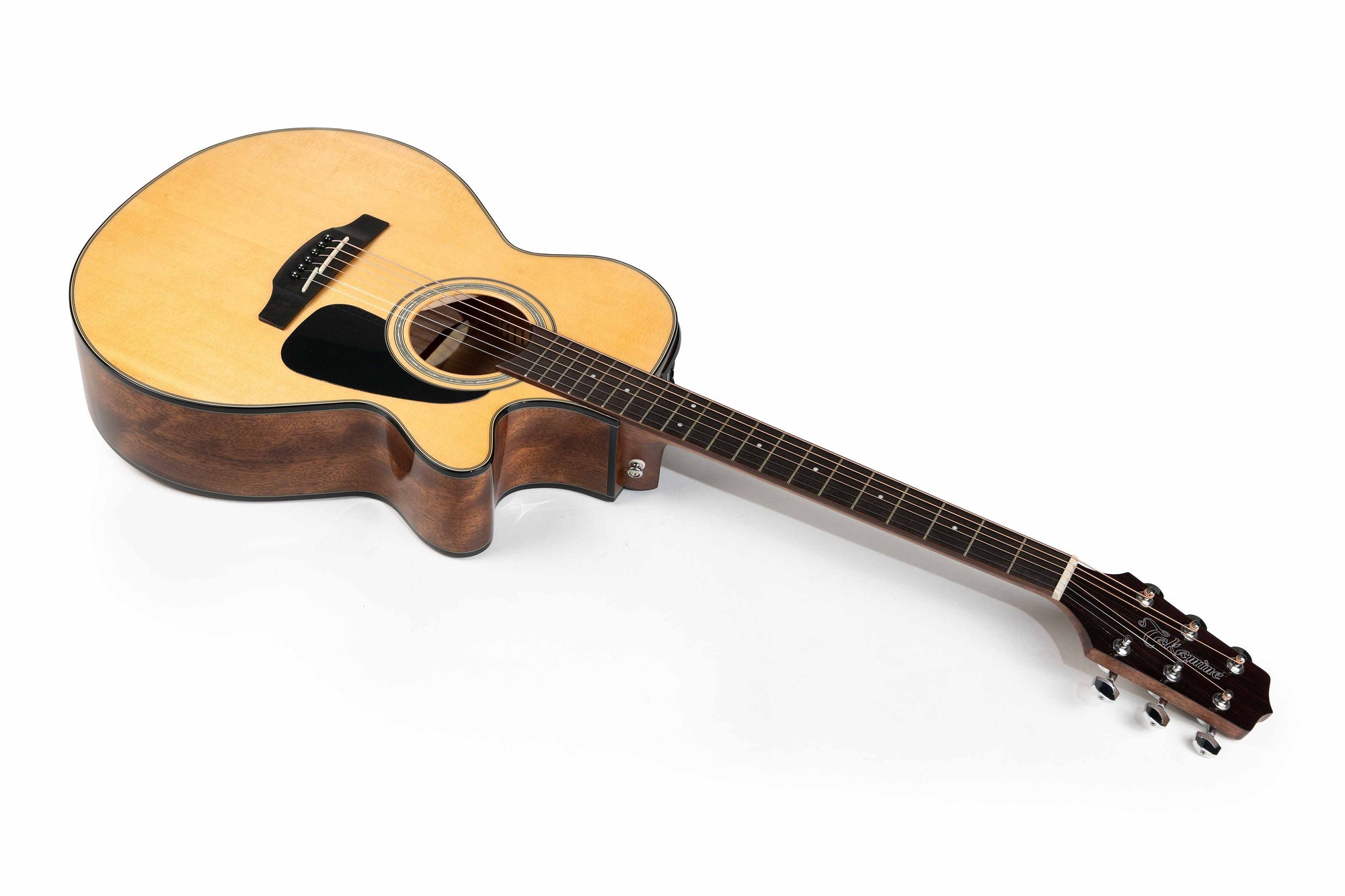 The Takamine GF30CE is a sleek-looking electro-acoustic guitar that combines solid-top construction with superior electronics and Takamine's compact FXC body style, featuring a soft Venetian-style cutaway. This model is an excellent choice for players seeking the well-balanced sound of a small-bodied guitar, offering notable sweetness and articulation.
